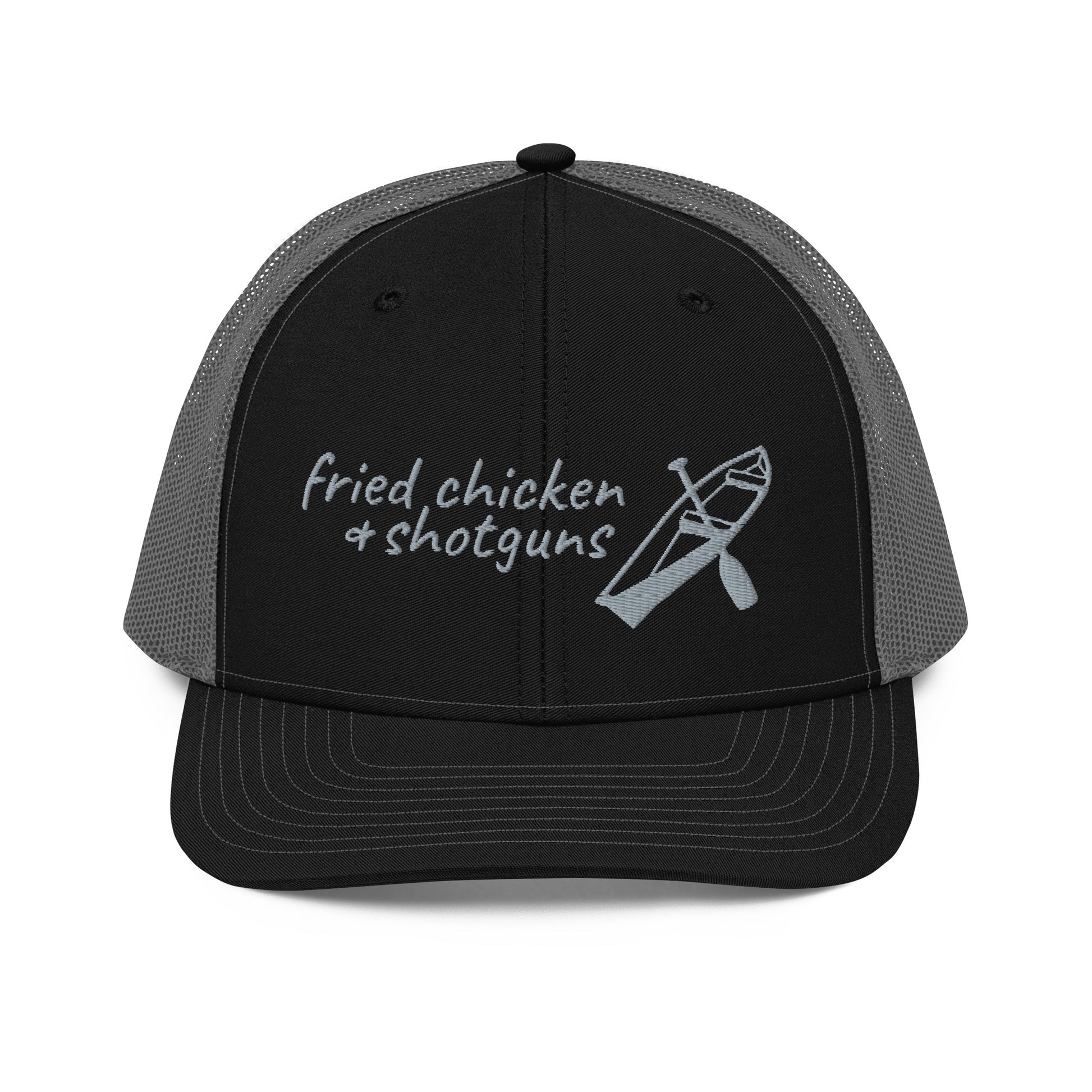 Support Fried Chicken & Shotguns with an embroidered trucker cap—it has a classic structured fit, adjustable plastic snapback, and a curved visor that matches its underbill.