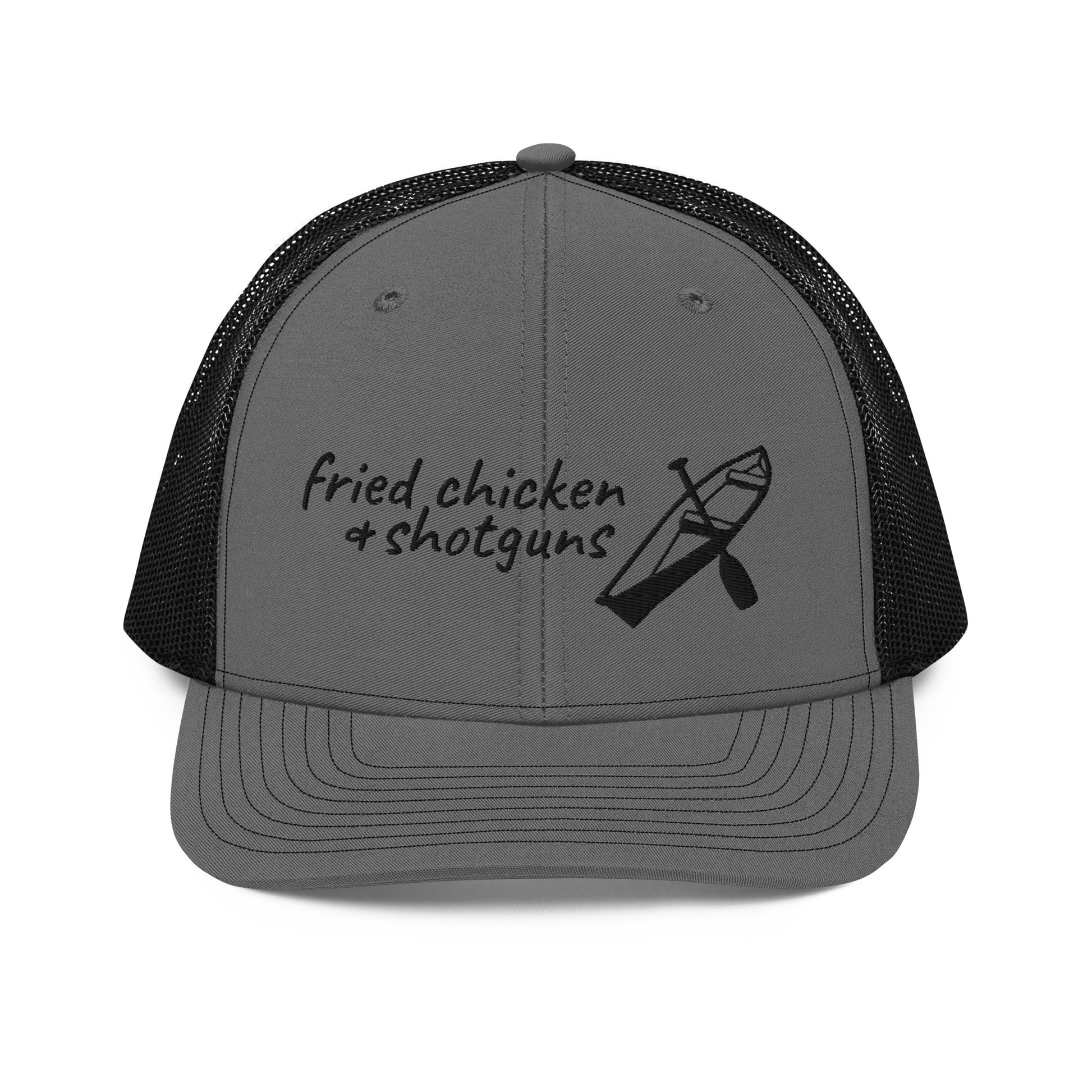 Support Fried Chicken & Shotguns with an embroidered trucker cap—it has a classic structured fit, adjustable plastic snapback, and a curved visor that matches its underbill. The cap and logo are both dark and very subtle.