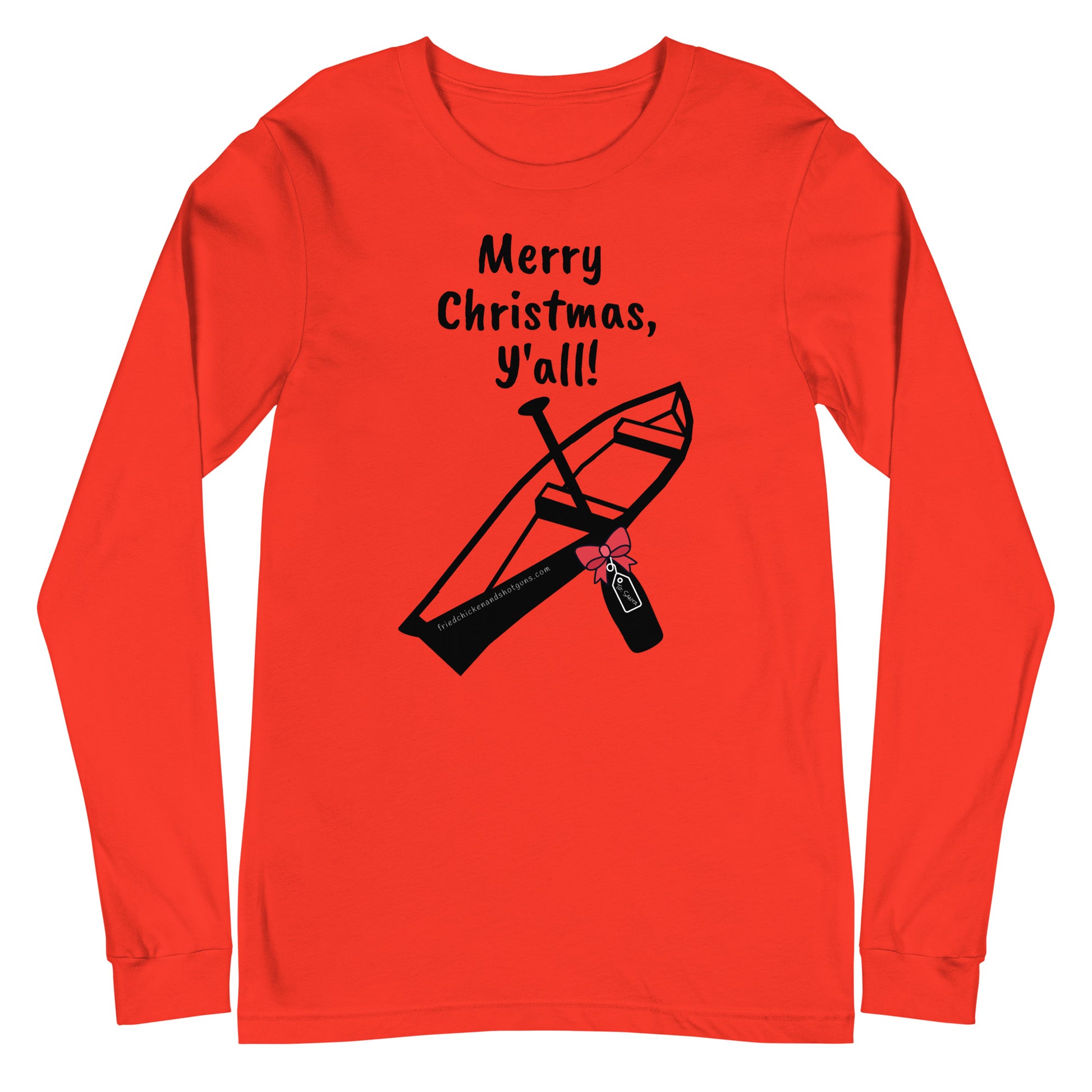 We think Santa should drive a pirogue! This long sleeve shirt is soft and lightweight. We find that you need to order one size UP for these shirts. (He wears a 2X and she wears an XL...see notes below about material, color, and sizing.)