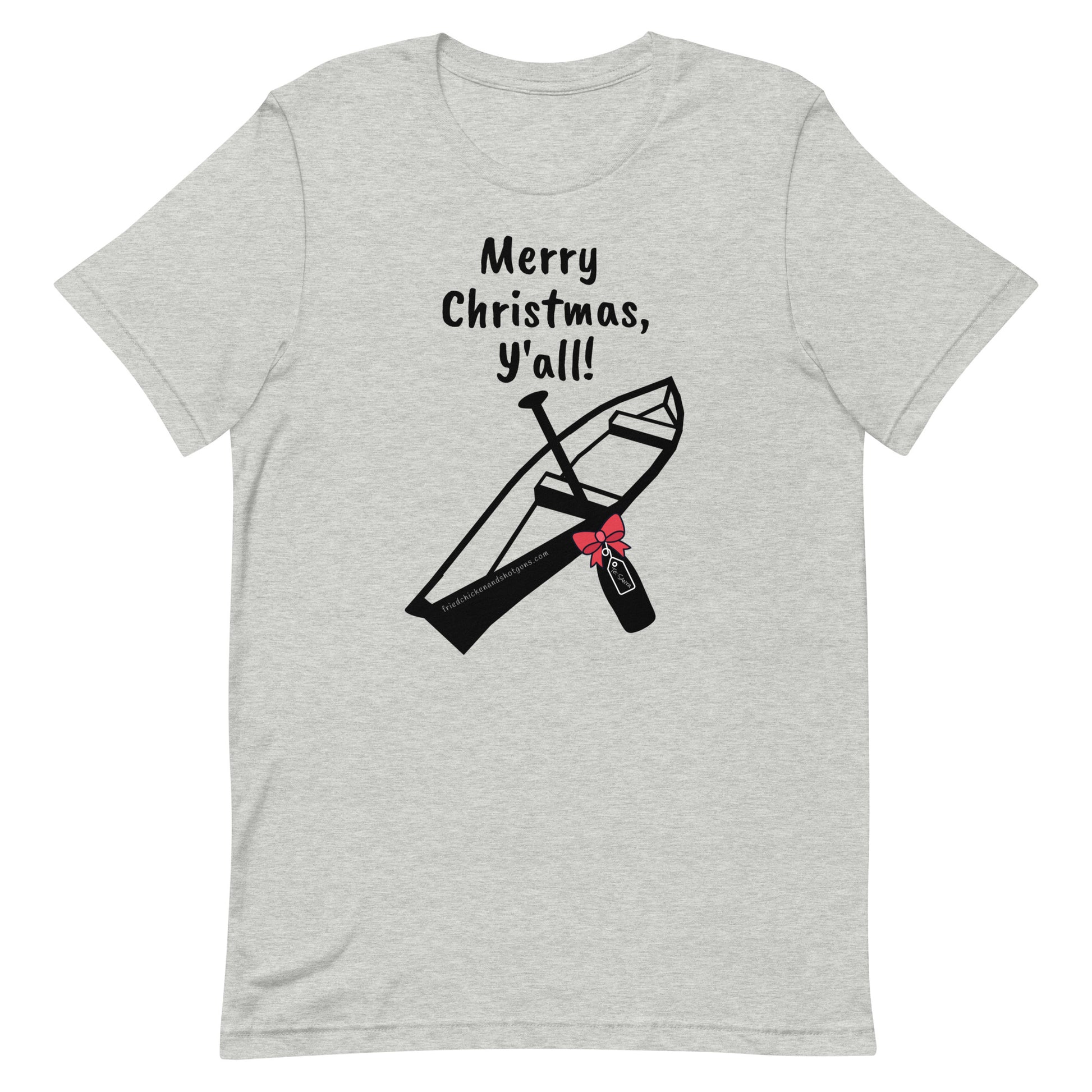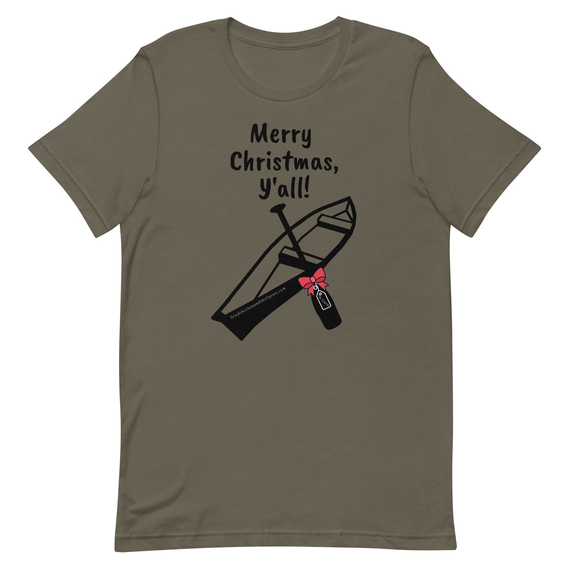 We think Santa should drive a pirogue! This t-shirt is soft and lightweight, with the right amount of stretch. It's comfortable and flattering for all. We find that you need to order one size UP for these shirts. (He wears a 2X and she wears an XL...see notes below about material, color, and sizing.)